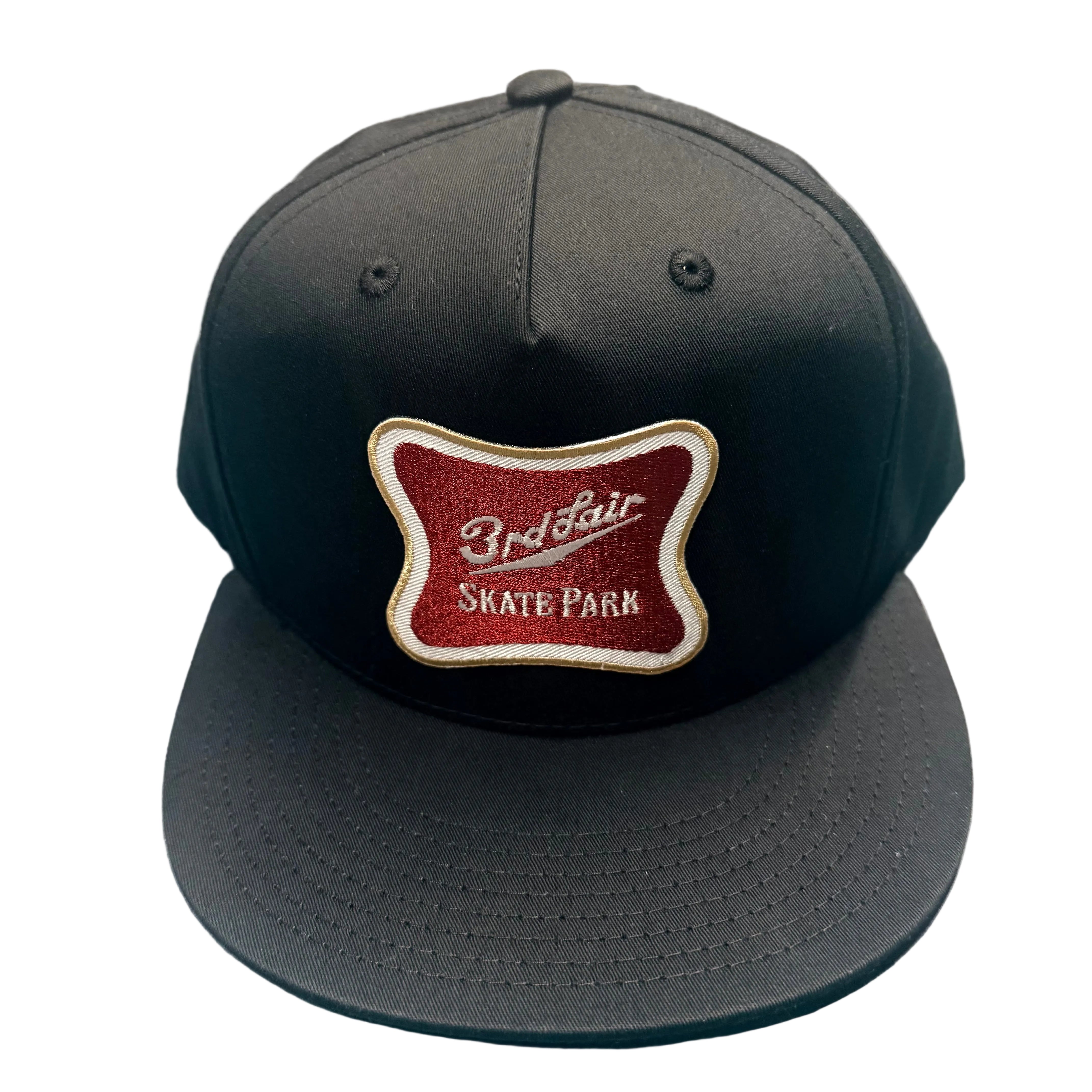 3rd Lair Champagne of skateparks logo patch on a flat bill hat