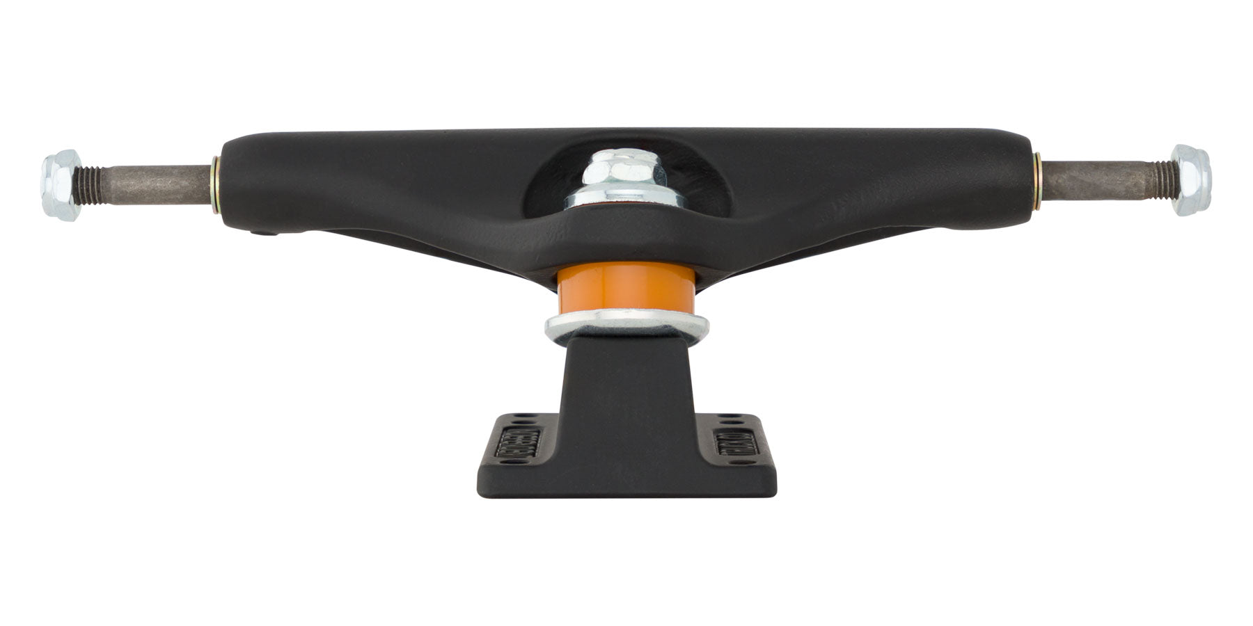 Independent Stage 11 Blackout trucks feature flat black powder coated hanger and baseplate with orange cushions and silver hardware.
