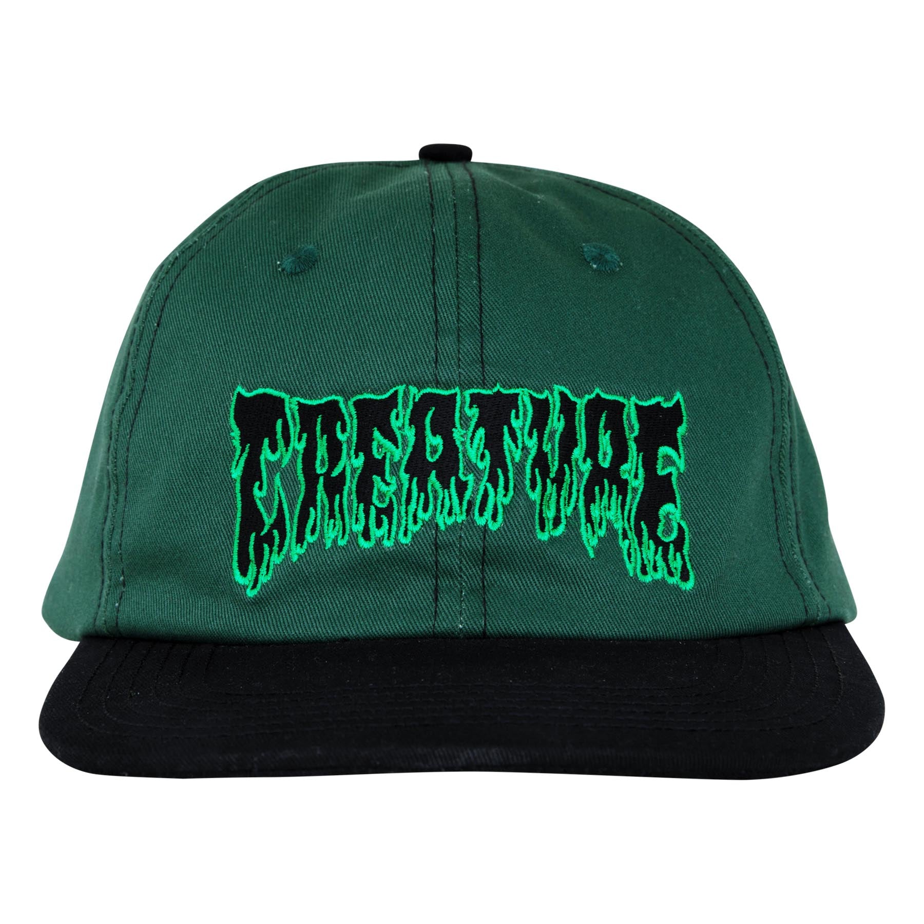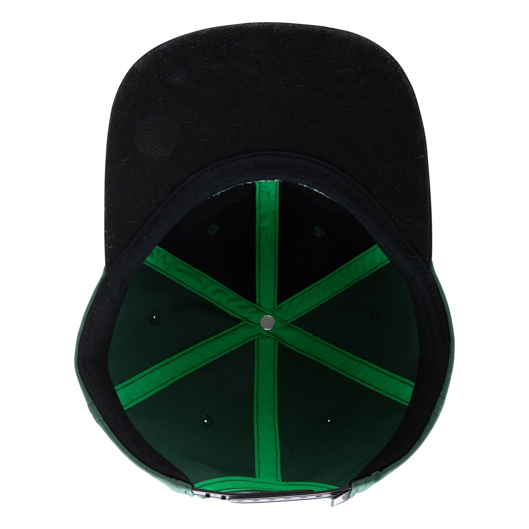 The Creature Hesher Flame unisex, low profile fit, unstructured snapback hat with 6 panel, direct front embroidery, loop label at rear adjuster and custom interior taping. Grey color has a contrast green underbill.